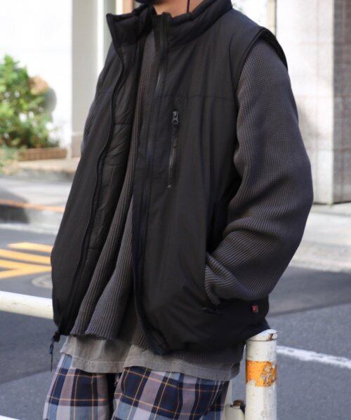 胸にジップポケットと両サイドにジップポケット付き、両サイドのポケット内部には裾のドローコードも付き調節可能。 インナーダウンの様な役割も担え、かつアウターとしての役割や、コートの上に着たりと着回しの効くベストとなっております。