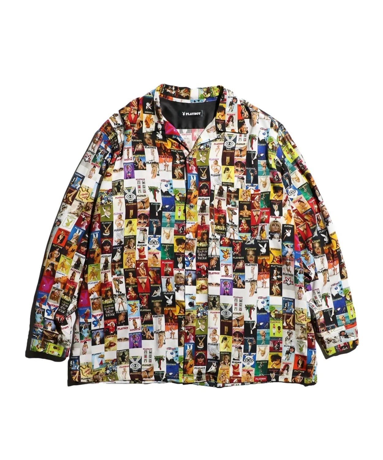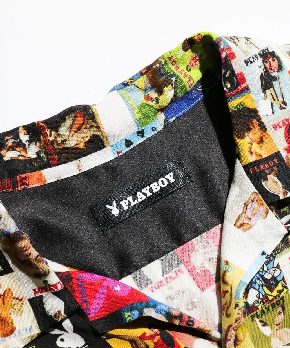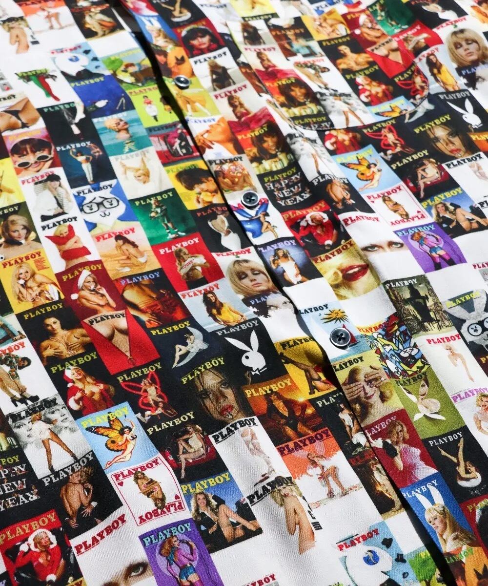 プリントは80-90年代に発売されたプレイボーイシャツを参考に、1960年代から1980年代の100枚のプレイボーイマガジン表紙を並べています。